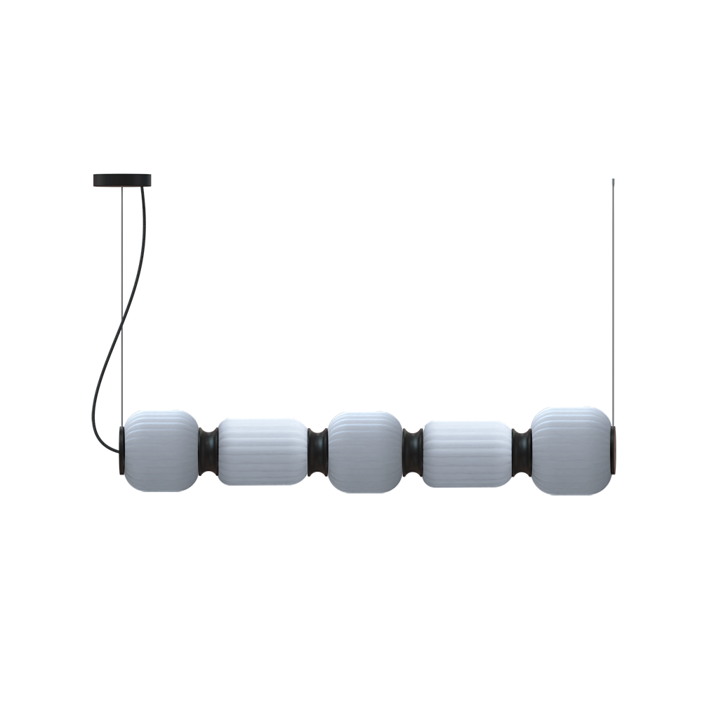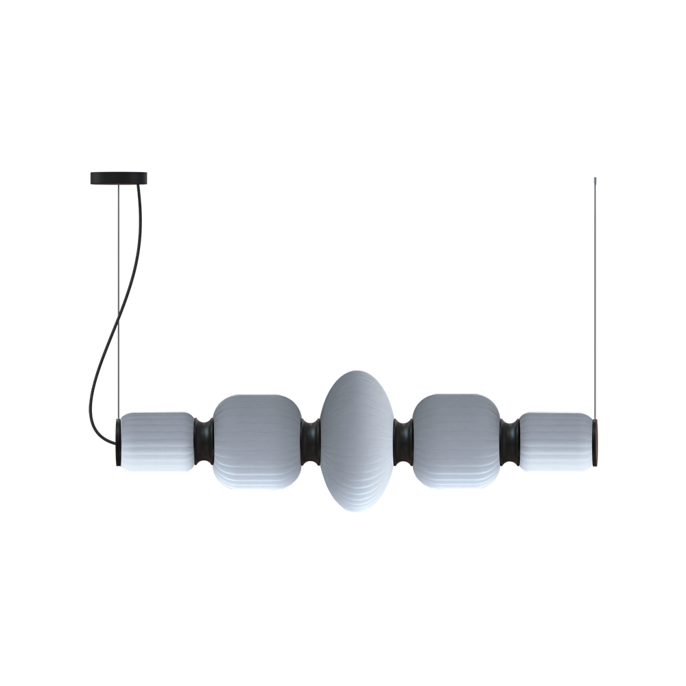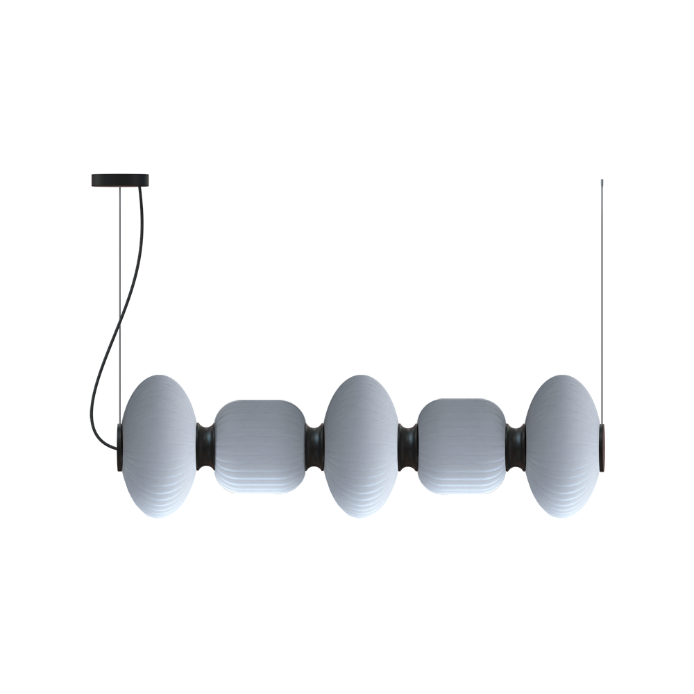 The Whiteberries Pendant Mix Quinted combines five hand-blown glass shades in a harmonious mixed arrangement, suspended by textile cables from an iron frame. Available in matte black and gold finishes, this quintet delivers 1400 lumens of warm 3000K light, offering a versatile and visually rich composition for expansive dining areas, hotel lobbies, or architectural installations seeking refined organic beauty.