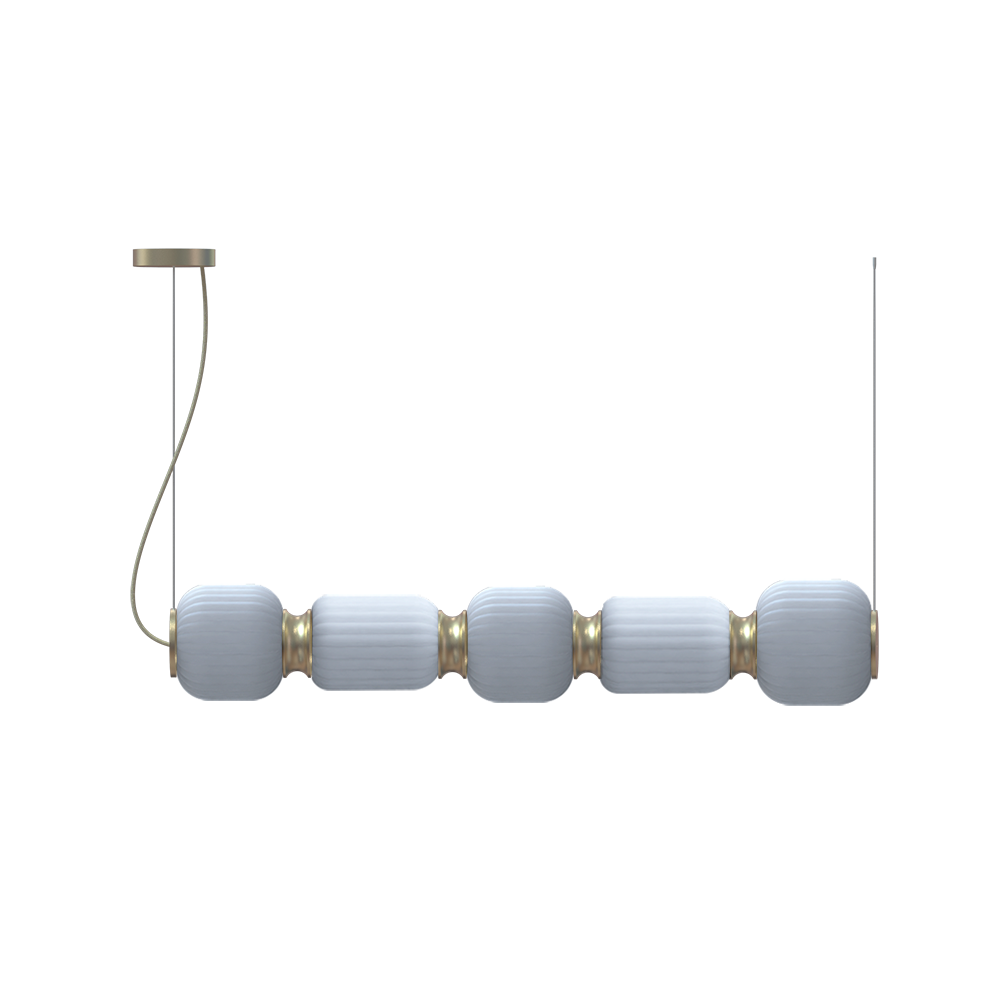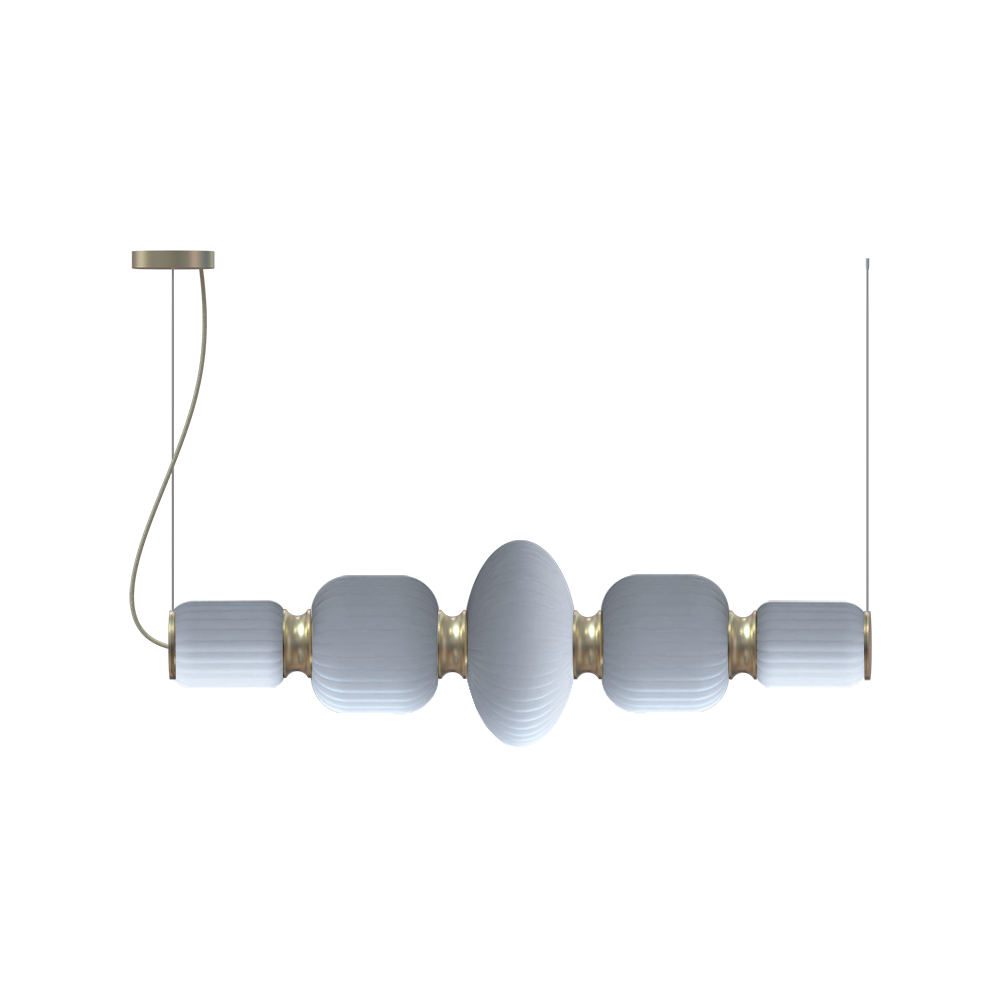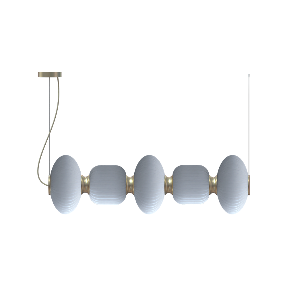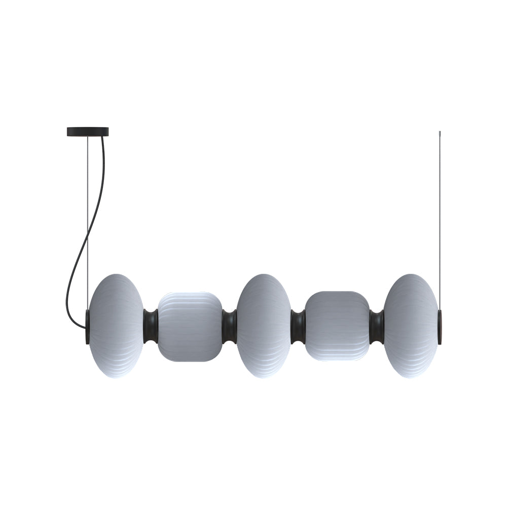 The Whiteberries Pendant Mix Quinted combines five hand-blown glass shades in a harmonious mixed arrangement, suspended by textile cables from an iron frame. Available in matte black and gold finishes, this quintet delivers 1400 lumens of warm 3000K light, offering a versatile and visually rich composition for expansive dining areas, hotel lobbies, or architectural installations seeking refined organic beauty.